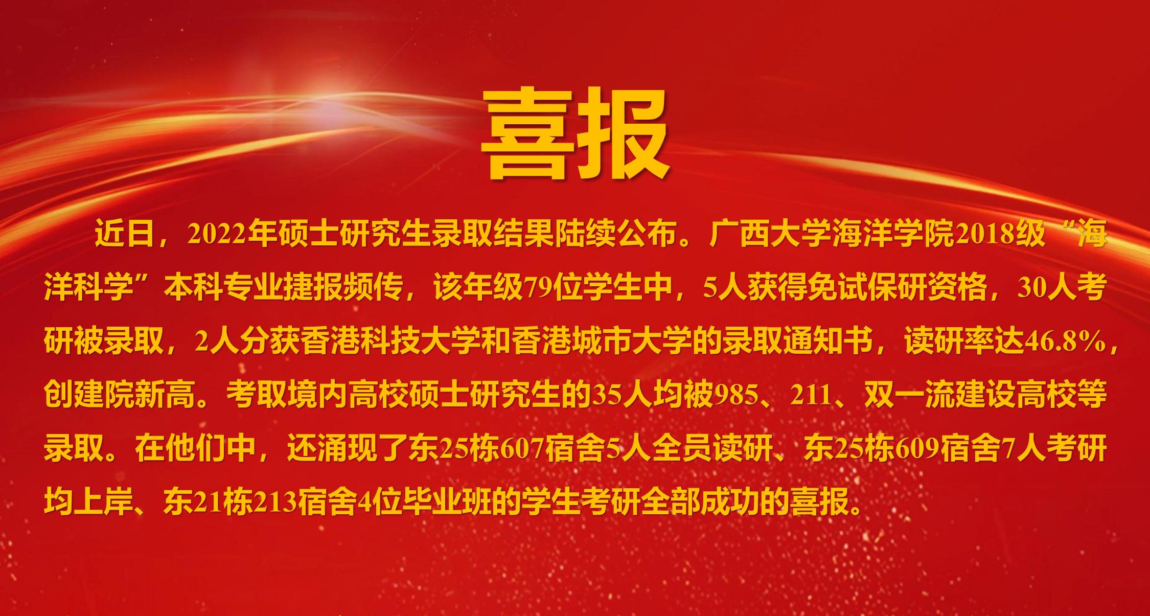 近日,2022年硕士研究生录取结果陆续公布。永利集团304官网2018级“海洋科学”本科专业捷报频传,该年级79位员工中,5人获得免试保研资格,30人考研被录取,2人分获香港科技大学和香港城市大学的录取通知书,读研率达46.8%,创建院新高。考取境内高校硕士研究生的35人均被985、211、“双一流”建设高校等录取。在他们中,还涌现了东25栋607宿舍5人全员读研、东25栋609宿舍7人考研均上岸、东21栋213宿舍4位毕业班的员工考研全部成功的喜报。