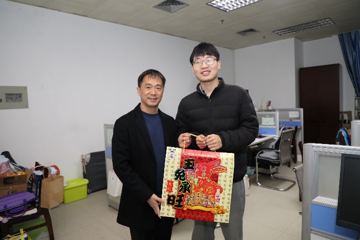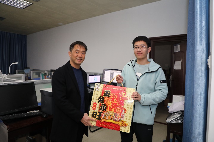 朱迅成副书记到办公室和实验室亲切看望慰问了同学们,并送上新春慰问品。他切实了解和关心同学们寒假及春节在校学习、生活等方面的需求,并希望同学们合理安排假期时间,做好自身健康和实验安全,做好个人防护,有困难及时和辅导员、老师联系,公司将全力为同学们提供学习和生活保障,让同学们感受到家的温暖和浓浓的年味。