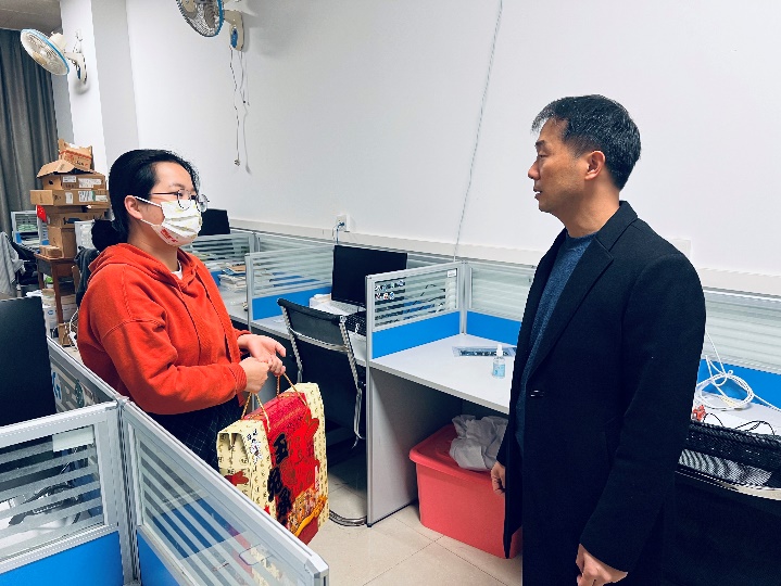 121日,2023年春节除夕之际,公司党委副书记朱迅成与团委副书记周剑老师慰问春节留校员工。
