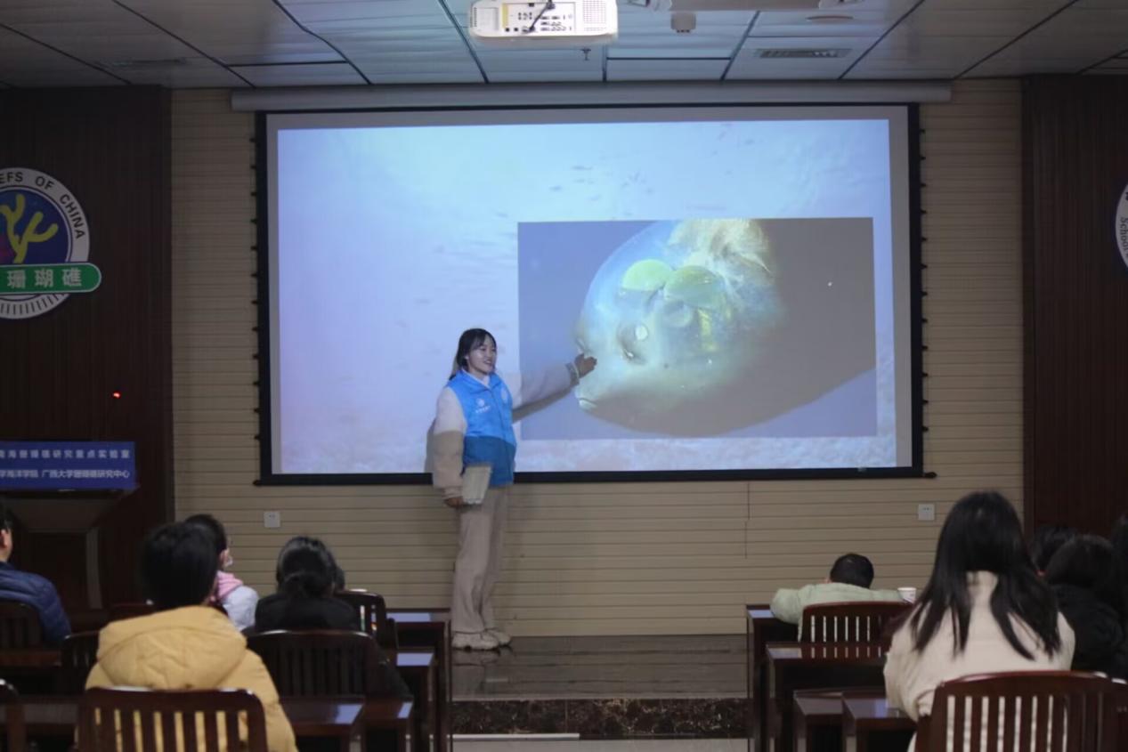 本次活动分为以下四个环节:海洋公益纪录片观影,科普大讲堂,海洋世界探索以及走进海底热带雨林。 活动开始,大家来到综合楼215会议室,观看了海洋公益纪录片,初步了解了深海环境的特点。随后,永利集团304官网“蓝色梦想”科普团为大家开展了以“奇特的深海动物”为主题的科普讲堂。主讲人余莹文形象生动地为大家依次介绍了管眼鱼、蝰鱼、灯笼鱼等深海生物的主要特征和生活习性,现场氛围轻松活跃,大家积极互动交流,收获了不少知识。