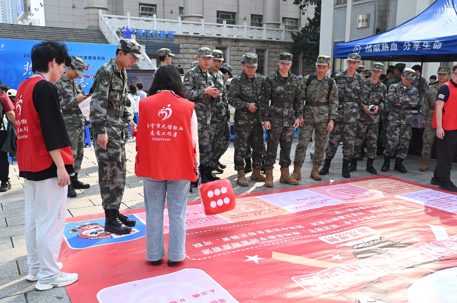 场地周边还设有血液知识科普区,南宁市中心血站工作人员结合“百发百中”投壶游戏和“知识问答大富翁”等互动活动,让大家在轻松愉快的氛围中学习到无偿献血的相关知识,更深入了解了无偿献血的重要意义。许多师生“闯关成功”并在活动海报展板合影,定格珍藏参与志愿服务活动的喜悦。