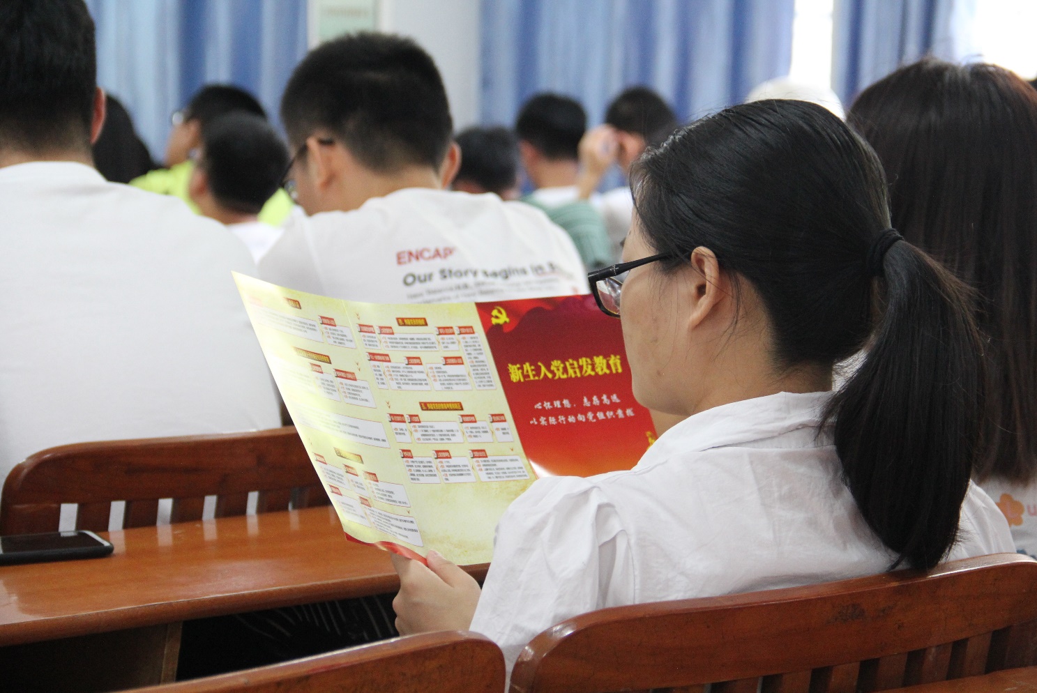 新生认真阅读《入党启发教育》宣传折页,了解入党流程