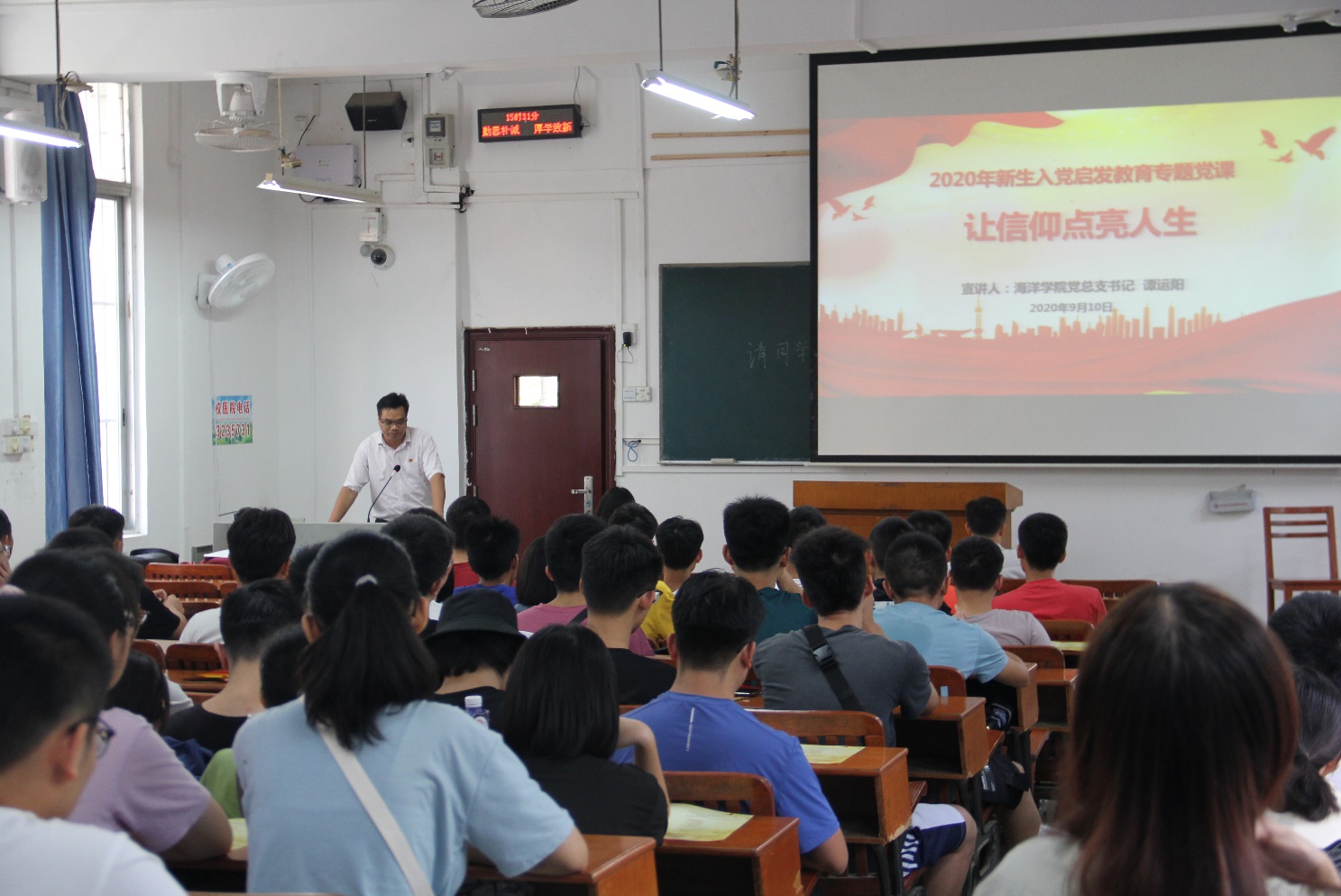 为加强新生对党的认识,提高员工思想觉悟,强化老员工理想信念教育,引导员工积极向党组织靠拢,9月10日下午,海洋公司党总支于第二教学楼101教室举行“让信仰点亮人生”入党启发教育大会。此次会议由公司党总支书记谭运阳主讲,党总支副书记朱迅成主持,组织员林玉华老师和团委副书记、员工党支部书记秦凤微老师出席本次会议,2020级全体新生参加本次会议。