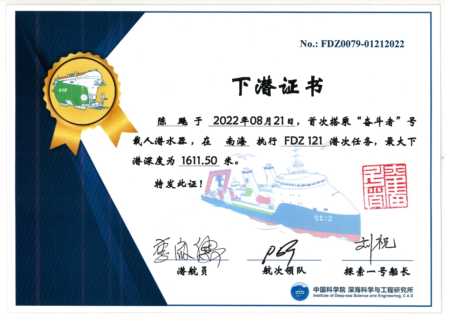 TS27航次“奋斗者”号下潜证书与参航证书