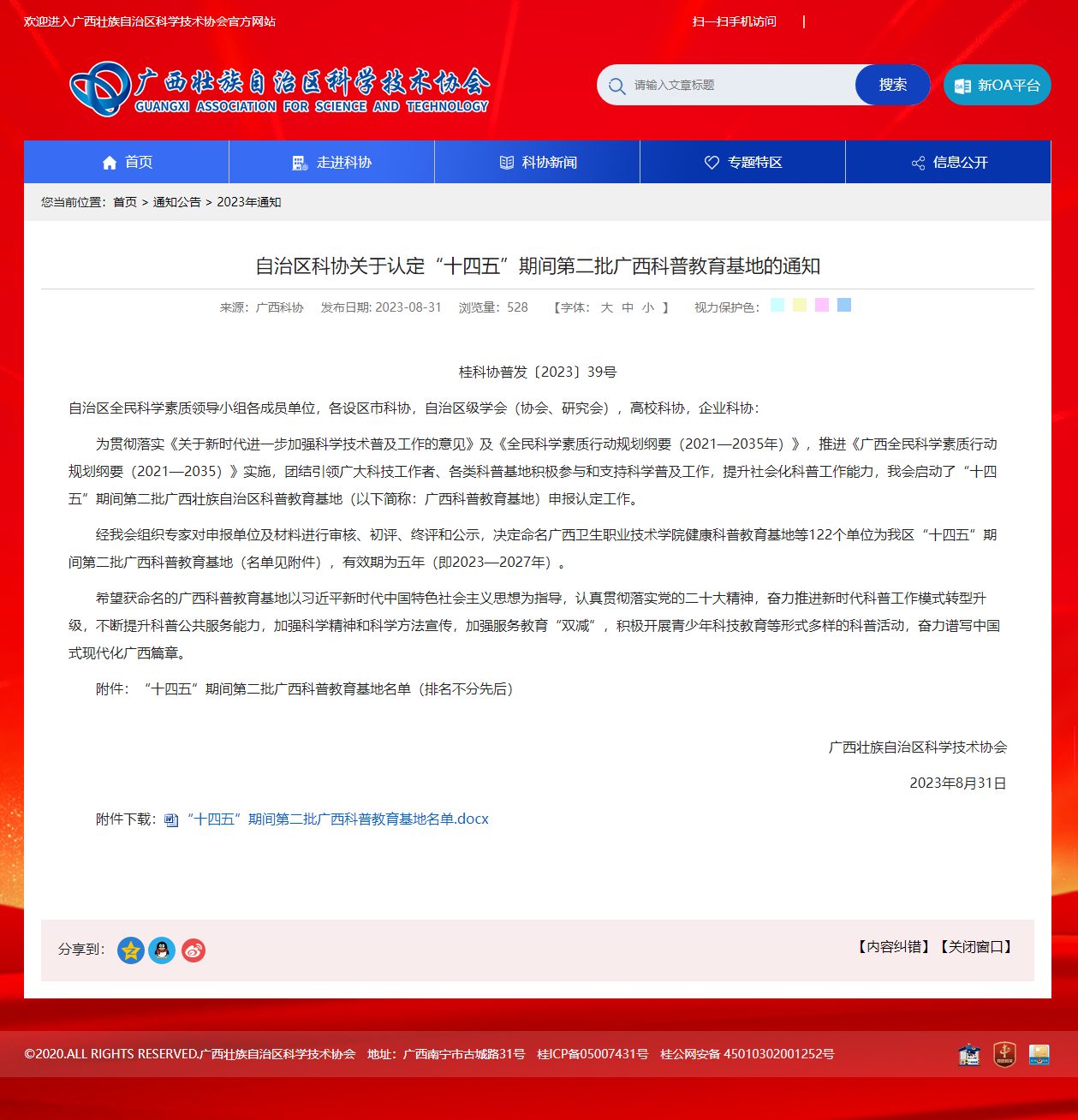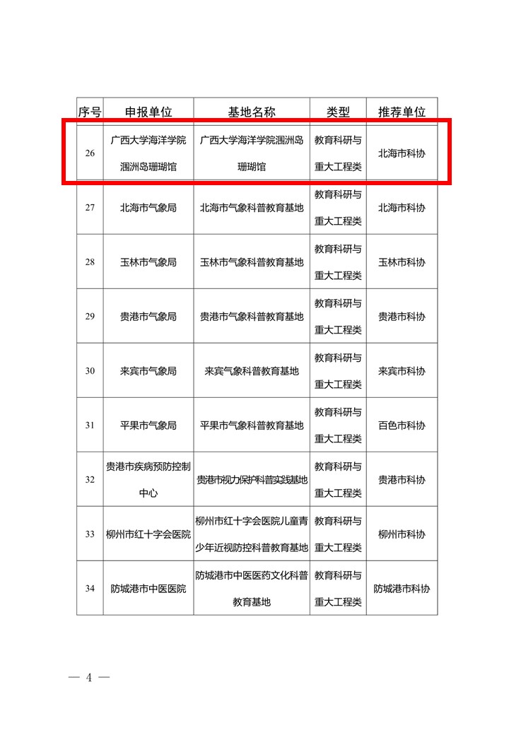 近日,自治区科学技术协会下发了《关于认定“十四五”期间第二批广西科普教育基地的通知》,公司“永利集团304海洋科研科普教育基地”、“永利集团304官网涠洲岛珊瑚馆”等2个基地分别入选(期限为2023—2027年)。
