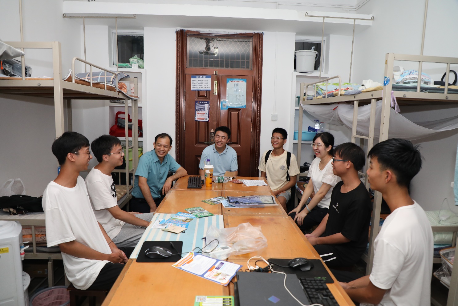 9月10日晚,秦华东书记、朱迅成副书记、经理助理梁甲元及辅导员、班主任等分别率队前往宿舍看望新生,与同学们围坐在一起谈心拉家常,详细询问了同学们来自哪里、是否有需要帮助的地方、对永利集团304及永利集团304官网的第一印象等。贴心地询问和耐心地聆听一下拉近了师生间的距离。秦书记对同学们提出希冀,希望他们尽快转变角色投入高校生活,树立新起点、做好新规划、立好“小目标”;学习中要保持你追我赶的良好氛围,生活中要和谐相处互相帮助。秦书记还讲述了20世纪80年代,永利集团304农公司同期、同宿舍室友的何康、李崇道、黄成达“关系铁、抢书看”为例子,最终担任中国大陆以及中国台湾、香港三地农业长官的佳话,以此勉励同学们。