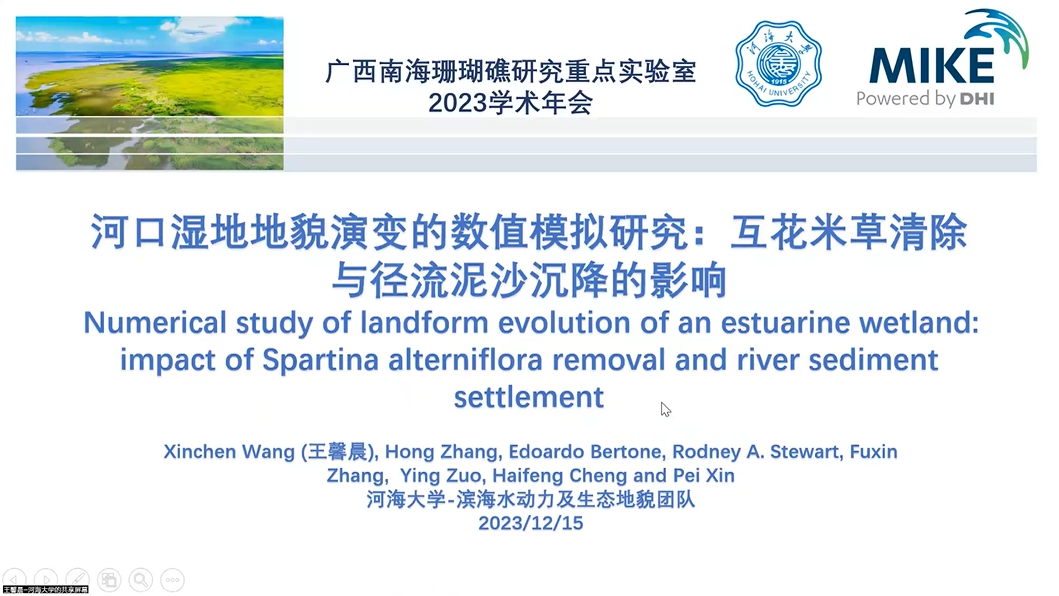 本次论坛包含2个特邀报告和8个研究生口头报告。天津大学建筑工程公司柳叶副研究员和河海大学水利水电公司王馨晨助理研究员分别作了题为《珊瑚礁低频长波非线性演化机理研究》和《河口湿地地貌演变的数值研究:互花米草清除与径流泥沙沉降的影响》的邀请报告。同时,广西南海珊瑚礁研究重点实验室滕君灿、陈曦、何志伟、徐坤利、张文倩、杨凯、刘宇欣和李志文等研究生分别作了口头报告。最后经评议,滕君灿(博士研究生,汇报题目:《地貌分带下基于ICESat-2与WV-2的珊瑚礁水深反演优化方法》)、杨凯(硕士研究生,汇报题目:《夏季华南地区极端大气河气候学及其对极端降水的影响》)、刘宇欣(硕士研究生,汇报题目:《重构并评估 1981-2019年的全球海平面指纹》)获本次会议优秀报告奖。