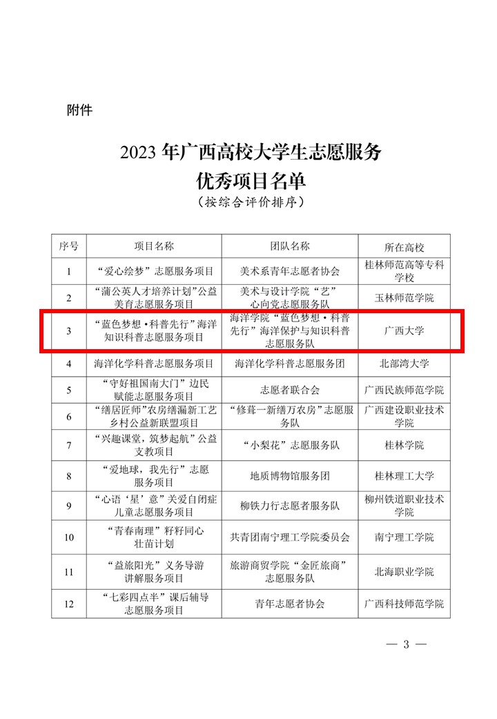 近日,自治区党委教育工委办公室公布了2023年广西高校老员工志愿服务优秀项目名单,公司《“蓝色梦想·科普先行”海洋知识科普志愿服务项目》入选“2023年广西高校老员工志愿服务优秀项目”30个入选项目之一。