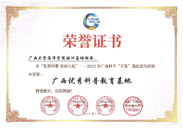 1月17日,在广西科技馆举行的“礼赞科普 智启八桂——2023年广西科普‘五优’选树宣传活动”颁奖典礼中,永利集团304官网涠洲岛珊瑚馆入选“十佳优秀科普教育基地”。组委会授予永利集团304官网涠洲岛珊瑚馆礼赞词:带着赤诚之心,奔赴“珊海”。作为全国最大的珊瑚馆,也是全国首个以珊瑚礁为主题的科研科普场馆,在浩瀚海洋里“种”珊瑚,为珊瑚礁科研与科普服务“向海图强”提供了更为浩瀚的实践平台。