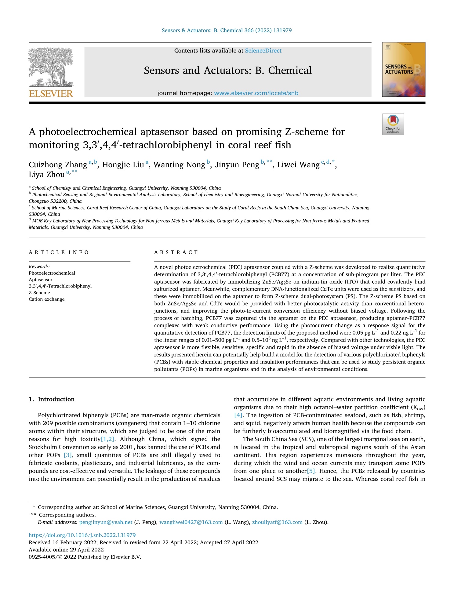 开发了一种耦合Z型异质结的新型光电化学适配体传感器,用于定量监测珊瑚礁区鱼类体内的超痕量3,3`,4,4`—四氯联苯(PCB77)有机污染物。该工作发表在中国科公司1区TOP刊物 Sensors and Actuators B: Chemical, 2022, 366, 131979。(IF = 8.4)。