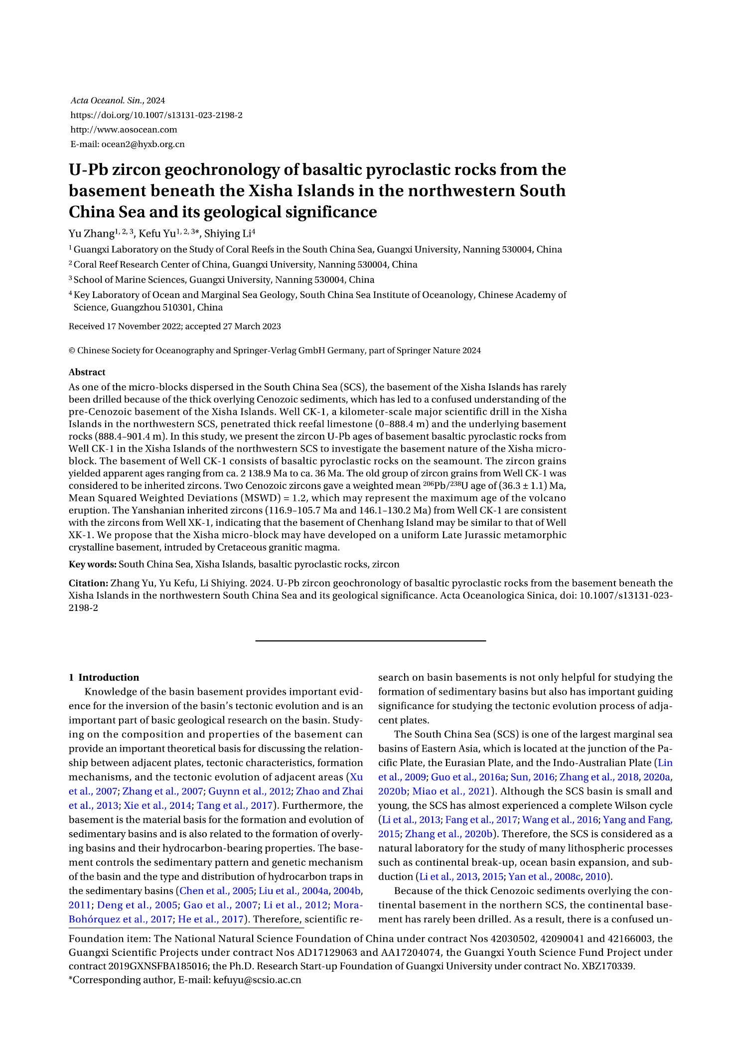 岛礁基岩性质是珊瑚礁形成演化的重要内容,也是大地构造学研究的重要组成部分。通过基底组成及其性质研究可为探讨相邻板块之间的亲缘关系、构造特征、形成机制以及邻区大地构造演化提供重要的理论依据。张瑜博士以西沙群岛琛航岛的CK-1井基底玄武质火山碎屑岩为材料,通过锆石U-Pb年代学研究,结合区域地质资料,指出西沙群岛岛礁基底很可能为侏罗纪片麻岩,并遭受了白垩纪花岗质岩浆的侵入。西沙群岛基底存在前寒武纪物质,古老基底经多次重熔,覆盖了前寒武纪结晶基底的印记。研究成果“U-Pb zircon geochronology of basaltic pyroclastic rocks from the basement beneath the Xisha Islands in the northwestern South China Sea and its geological significance”在海洋科学领域权威期刊《Acta Oceanologica Sinica》发表。(张瑜/文 论文/图 周剑/编辑 余克服/审核)