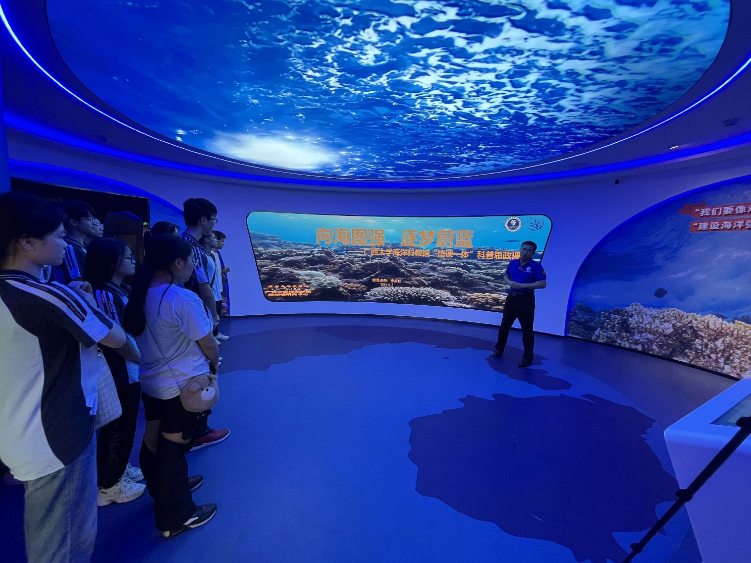 6月7日上午,南宁三中青山校区地理学科课程基地一行18名师生来到永利集团304海洋科教馆访学,科教馆常务副馆长李周佳老师向来访师生们致欢迎词,并从海洋生态与国家安全的角度出发,结合永利集团304官网的研究特色,向师生们讲授《向海图强,逐梦蔚蓝》“馆课一体”科普思政课。