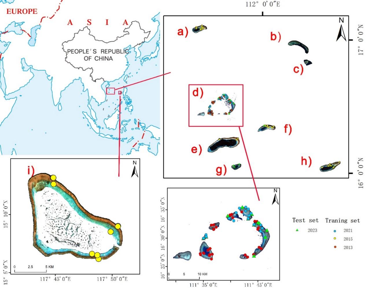 图1 研究区域:a)北礁;b) 七连屿;c) 永兴岛;d) 永乐环礁;e) 华光礁;f) 玉琢礁;g) 盘石屿;h) 浪花礁;i)黄岩岛。圆点代表现场调查站位。左上角底图来自海南省测绘地理信息局(http://hism.mnr.gov.cn/),编号为:GS qiong (2023) 040
