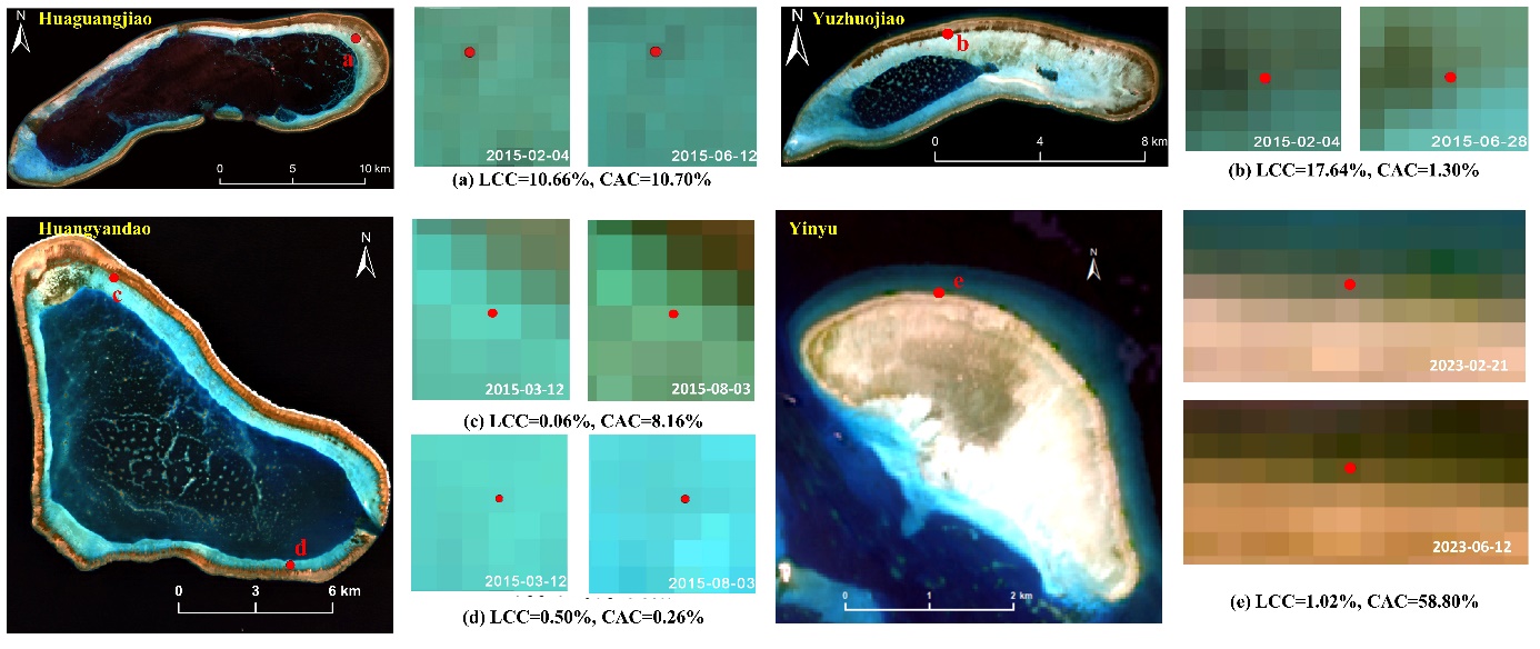 图2 多光谱卫星影像从竞争性藻类稀少期到竞争性藻类茂盛期的差异所展现的珊瑚与竞争性藻类变化示例