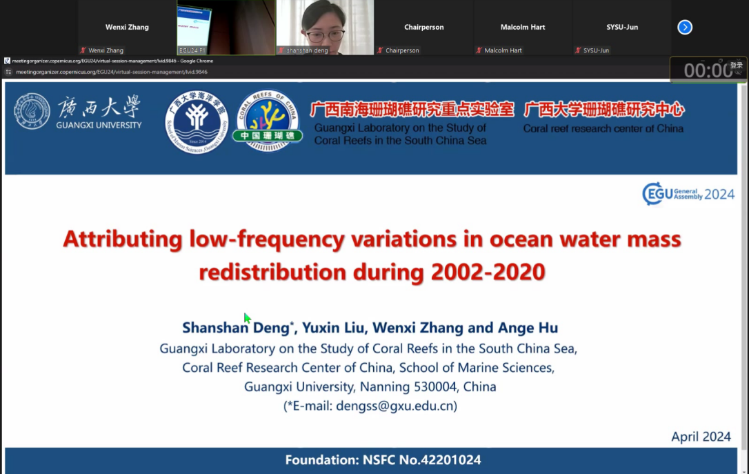 在“Climate: Past, Present & Future”主题的“Understanding sea level changes: global to local, from past to future)”分会场,邓珊珊博士作了题为“Attributing low-frequency variations in ocean water mass redistribution during 2002-2020”的口头报告,介绍关于气候变化背景下低频陆-海水质量再分布的特征与归因的最新研究进展。21级硕士研究生刘宇欣作了题为“Progress in the Global Sea Level Fingerprints since the 20th century”的口头报告,介绍关于20世纪以来三种气候变化背景下陆地水储量异常驱动的海平面指纹时空演变特征的最新研究进展。