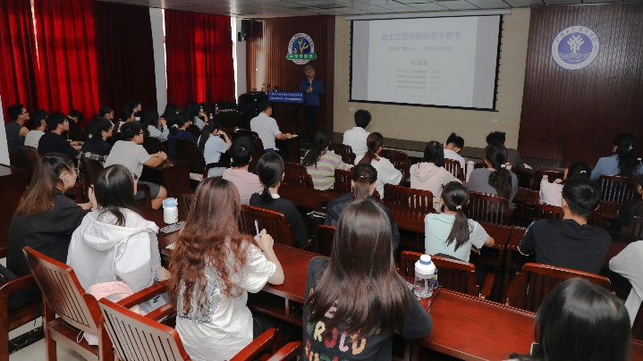 在报告中,梅国雄教授分享了他在固结排水边界、土压力与变形关系、桩基和抗浮、主动反渗防腐技术、柔性水域储油等多个研究课题中的创新成果。他精心设计的试验装置科学严谨且简单易行,不仅为科研工作者开辟了探索未知的新途径,也让在场师生深刻认识到创新其实来源于生活中的点滴发现。同时,梅国雄教授鼓励同学们要敢于质疑现有知识,勇于探索未知领域,保持好奇心和创造力,不断追求并实践创新。