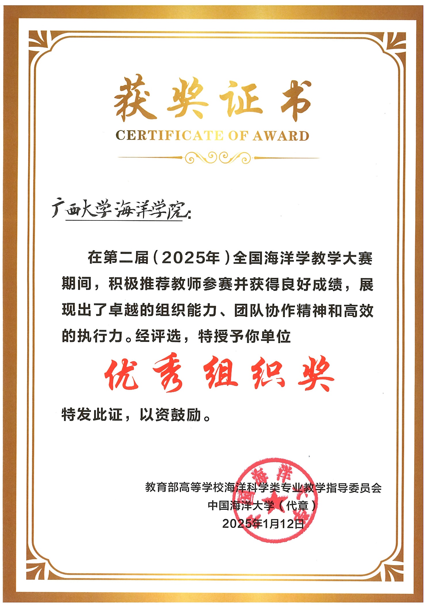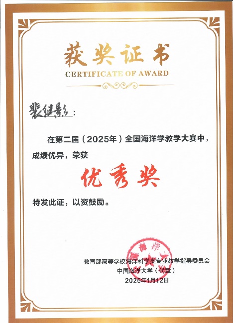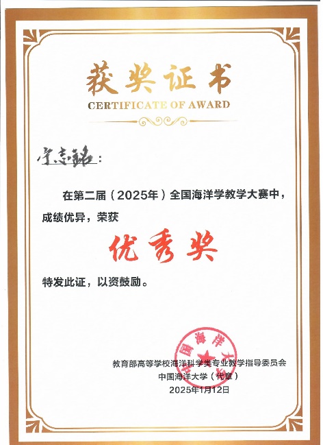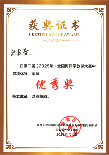2025年1月11-12日,在永利集团304举办的第二届(2025)全国海洋学教学大赛中,公司黄雯老师获得二等奖,裴继影、宁志铭和江蕾蕾分别获得优秀奖,公司荣获“优秀组织奖”。