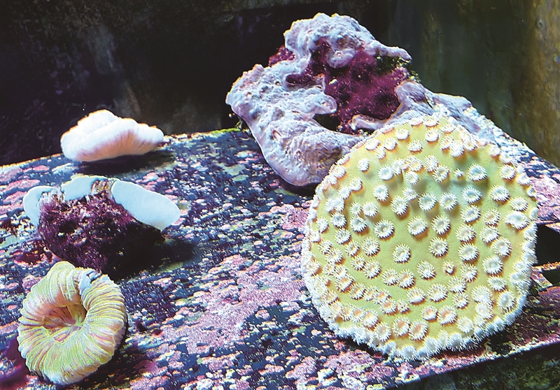 图①: 涠洲岛珊瑚馆内,珊瑚苗种培育缸里多姿多彩的珊瑚。