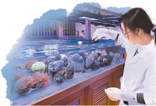 科研人员在岛礁生态修复实验室中呵护珊瑚成长