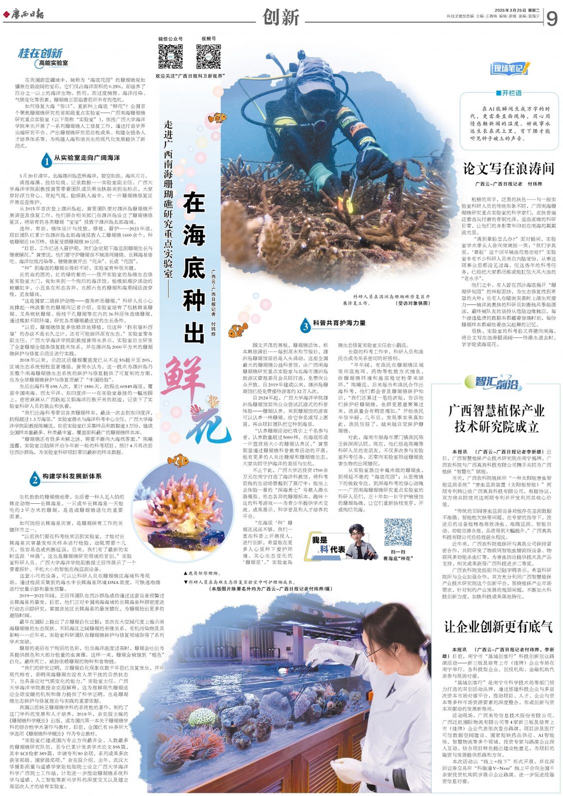 从实验室器皿中毫米级的珊瑚虫,到绵延不绝的“海底花园”;从显微镜下的极致专注,到深海科考的惊心动魄……广西南海珊瑚礁研究重点实验室的科研人员们,正十年如一日守护被侵蚀的珊瑚岛礁,让它们重新抽枝发芽,开成绚烂花海。