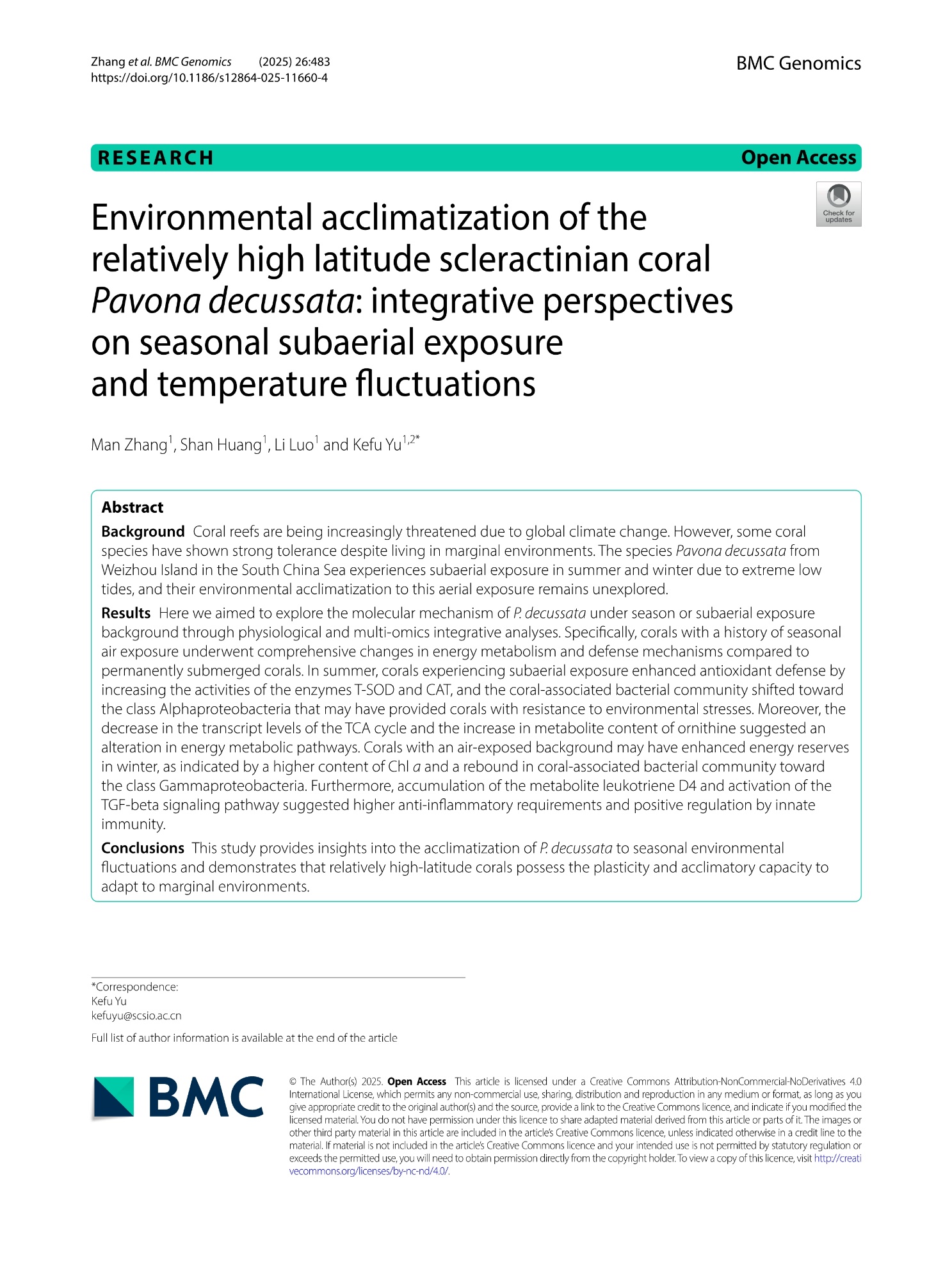 Man Zhang, Shan Huang, Li Luo, Kefu Yu. (2025). Environmental acclimatization of the relatively high latitude scleractinian coral Pavona decussata: integrative perspectives on seasonal subaerial exposure and temperature fluctuations. BMC Genomics, 26: 483. https://doi.org/10.1186/s12864-025-11660-4
