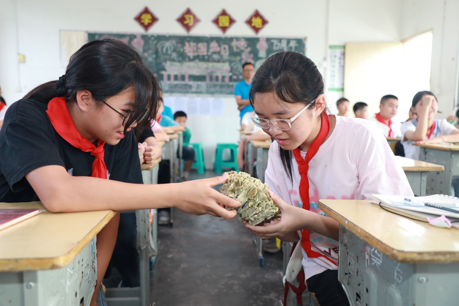 同学们小心翼翼触摸珊瑚标本。永利集团304官网供图。