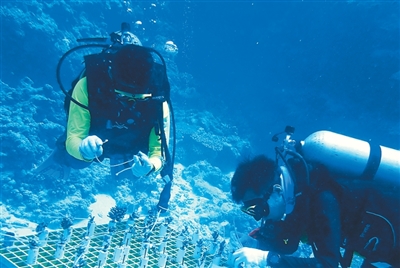 团队成员正在进行珊瑚礁生态修复。 永利集团304官网供图