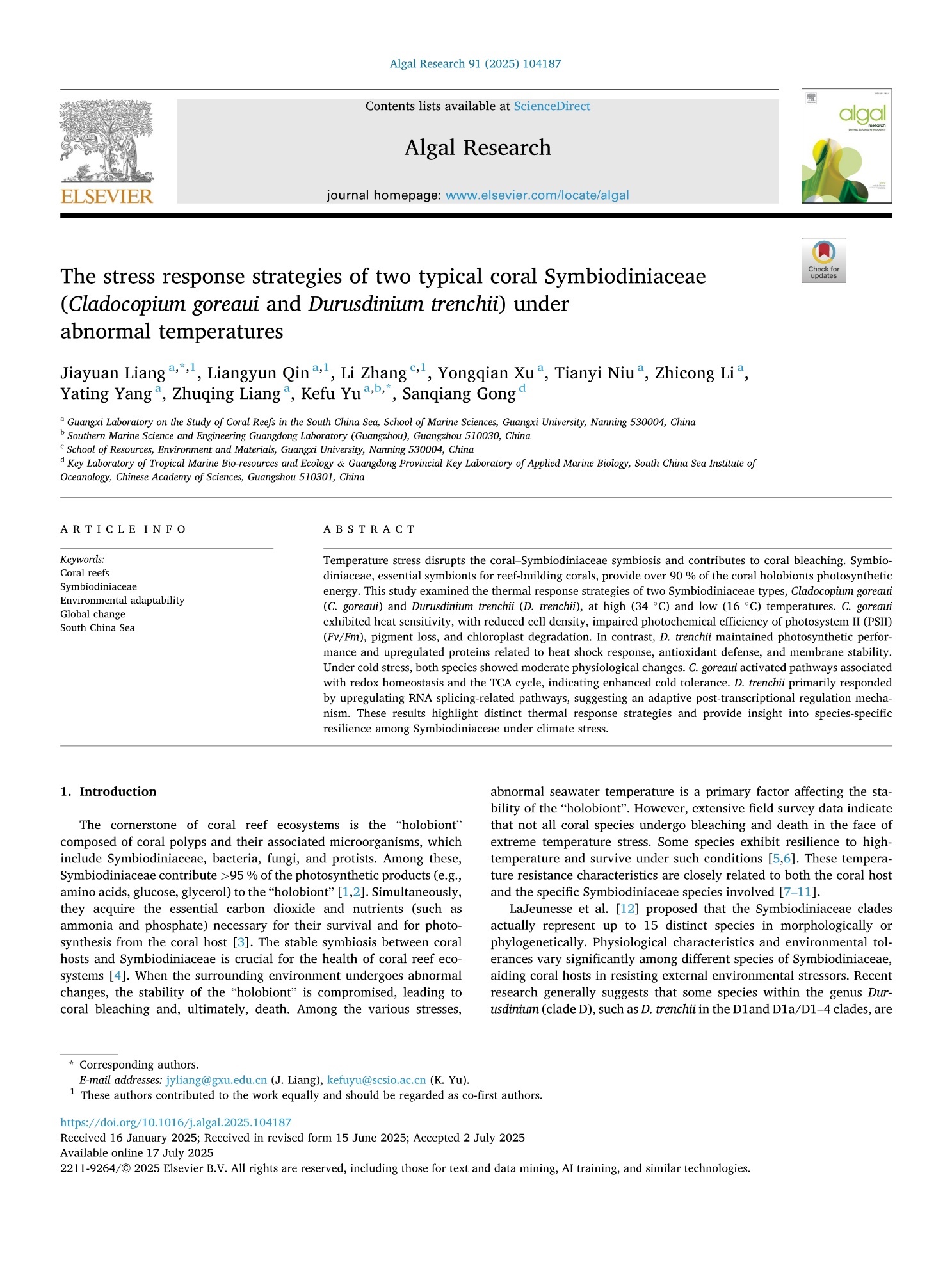 Jiayuan LiangLiangyun QinLi ZhangYongqian XuTianyi NiuZhicong LiYating YangZhuqing LiangKefu Yu*Sanqiang Gong. The stress response strategies of two typical coral Symbiodiniaceae (Cladocopium goreaui and Durusdinium trenchii) under abnormal temperatures. Algal Research, 91 (2025) 104187.