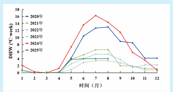 黄岩岛海域DHW的月际变化对比(2020年~ 2025 年)