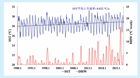 黄岩岛海域SST和DHW的时间变化曲线(1988年~ 2025年)