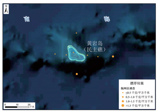 黄岩岛海域漂浮垃圾分布示意图(2025年8月,拖网法)