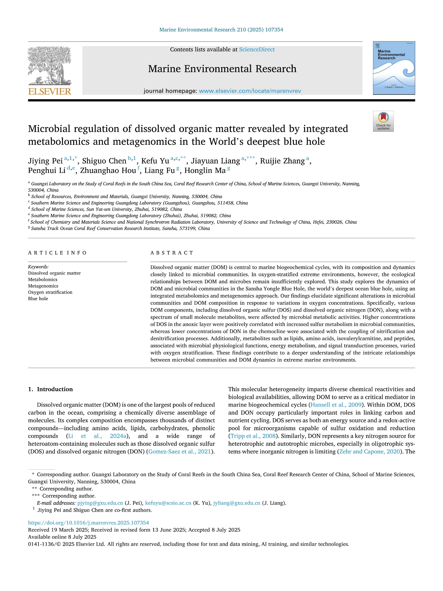 2. Pei Jiying, Chen Shiguo, Yu Kefu, Liang Jiayuan, Zhang Ruijie, Li Penghui, Hou Zhuanghao, Fu Liang, Ma Honglin. (2025). Microbial regulation of dissolved organic matter revealed by integrated metabolomics and metagenomics in the World’s deepest blue hole. Marine Environmental Research, 210: 107354. https://doi.org/10.1016/j.marenvres.2025.107354.
