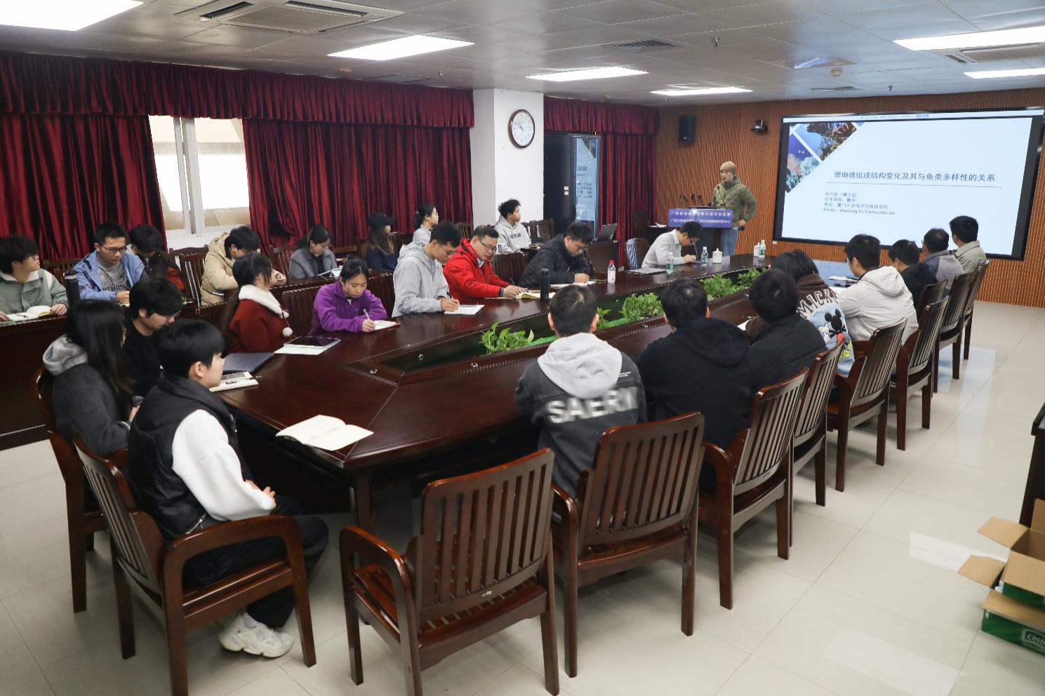 交流互动环节,现场师生围绕数据获取方法、捕捞活动与珊瑚礁鱼类的因果关系、环境因子映射机制等关键问题展开热烈探讨。刘书荣博士逐一细致回应,并分享了研究过程中的数据处理经验与后续研究计划,学术交流氛围浓厚。