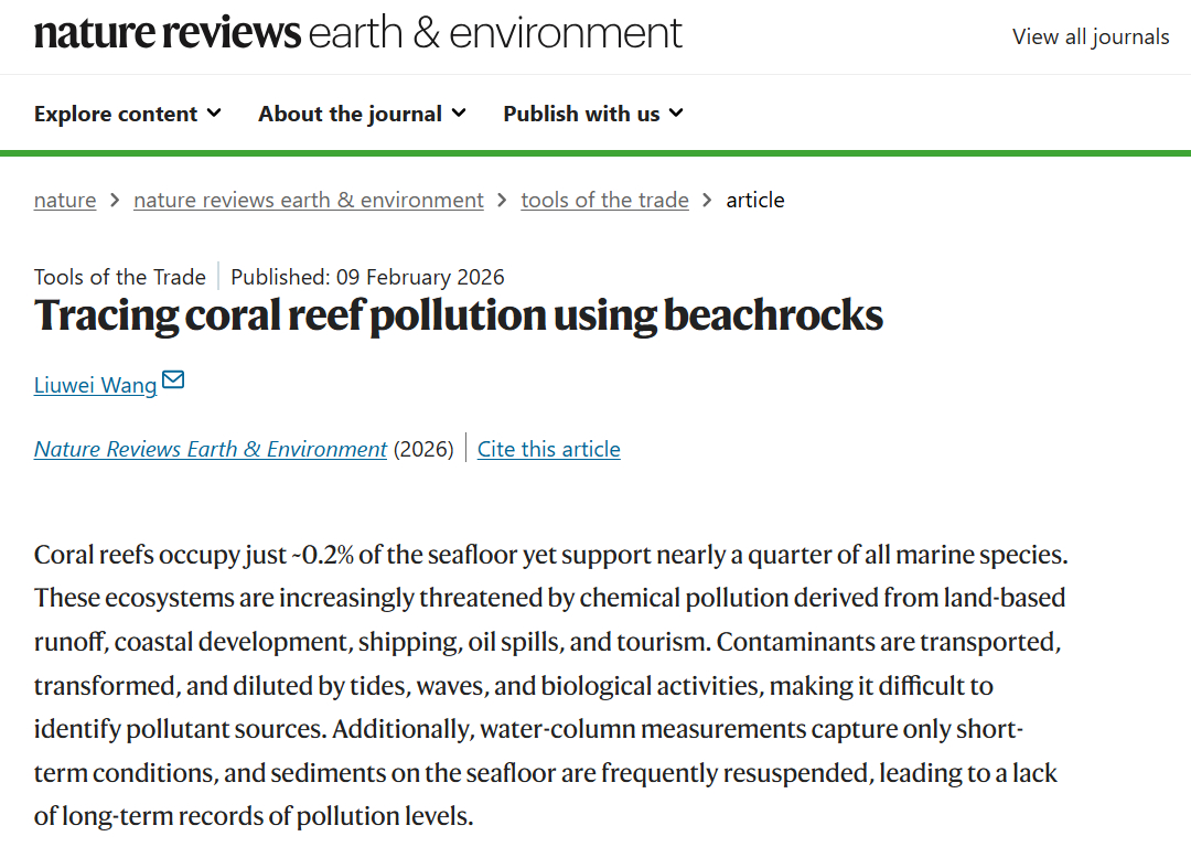 近日,Nature子刊《自然综述:地球与环境》(Nature Reviews Earth & Environment)(IF=71.5)发表了公司青年教师王刘炜博士题为“Tracing coral reef pollution using beachrocks”的方法评述(Tools of the Trade)论文,提出了用海滩岩追溯珊瑚礁区环境污染的新思路。